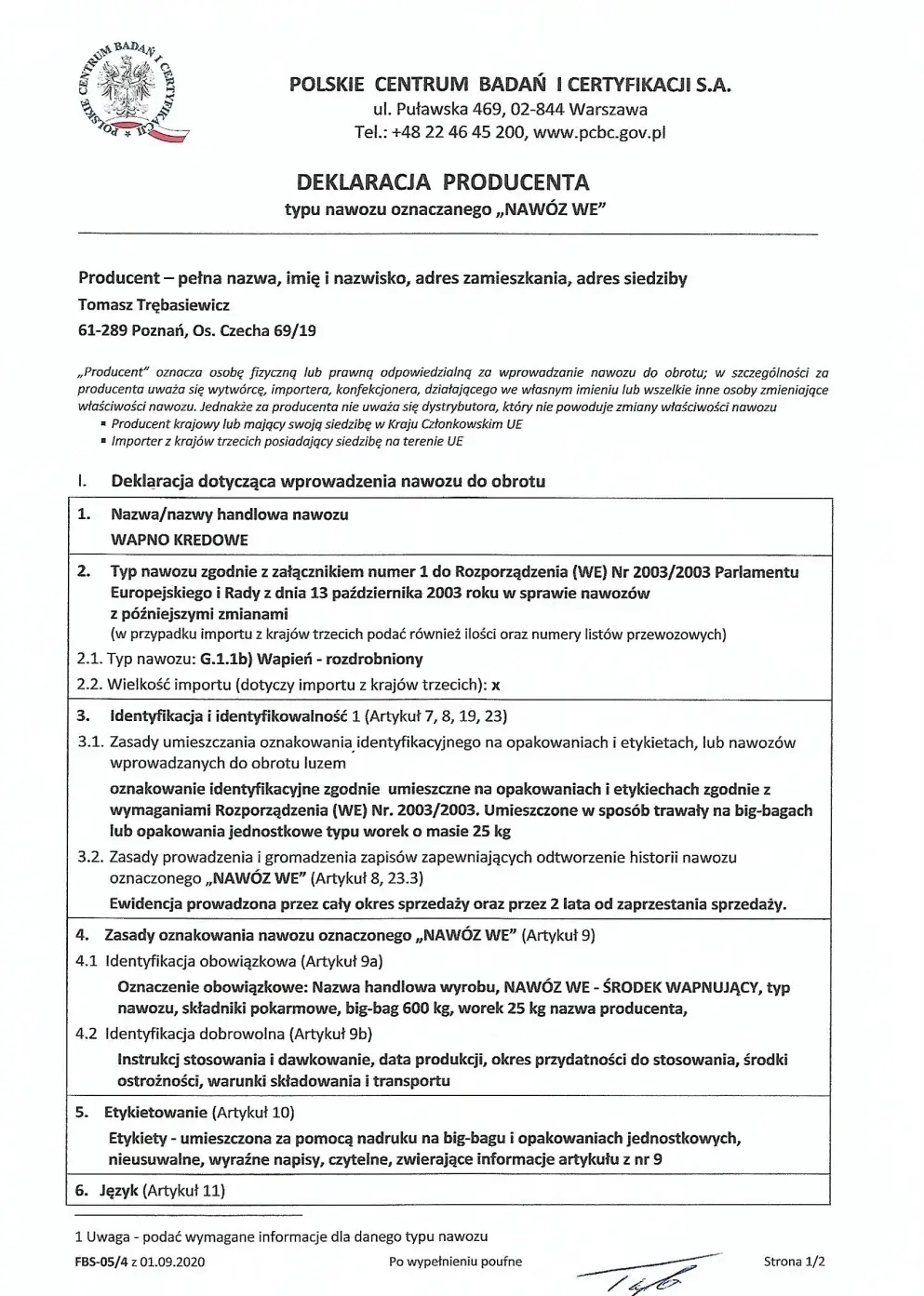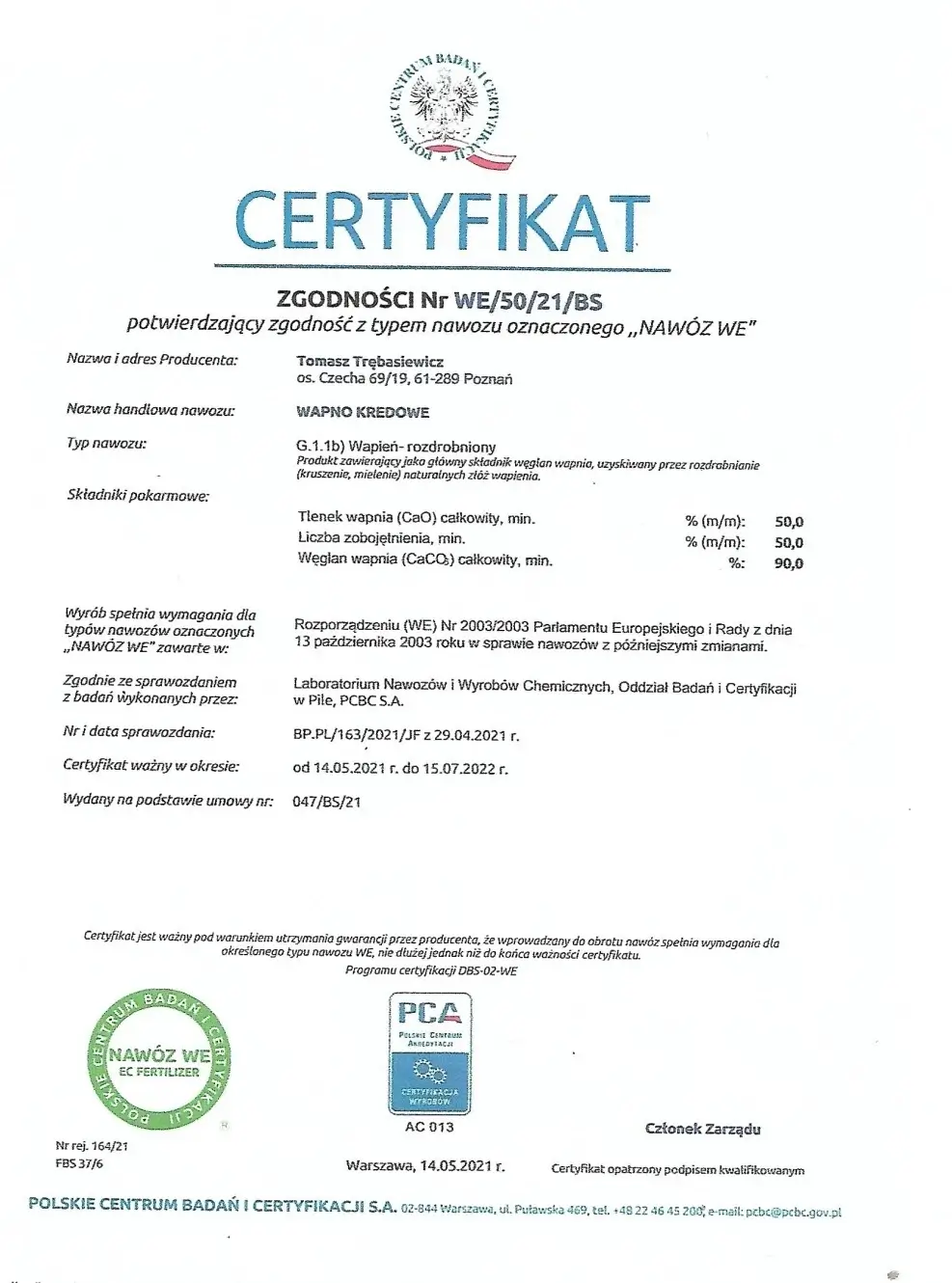 Wapno zostało przebadane i uzyskało certyfikat zgodności WE/50/21/BS